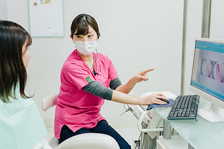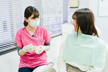 MTMとはメディカルトリートメントモデルのことで、歯周病の予防から、発症後の治療、そして治療後のメインテナンスまで患者さんに合わせてトータルにサポートするプログラムです。歯周病は再発しやすい病気です。一度、治療を受けて治癒しても、毎日のセルフケアが足りないと、ふたたび発症しやすいのです。そのため毎日の丁寧なセルフケアに加えた定期的なメインテナンスの受診が重症化を防ぐことにつながります。歯科衛生士は口腔ケアのプロフェッショナルですので、患者さんの担当歯科衛生士がお口の状態に合わせて診療いたします。
